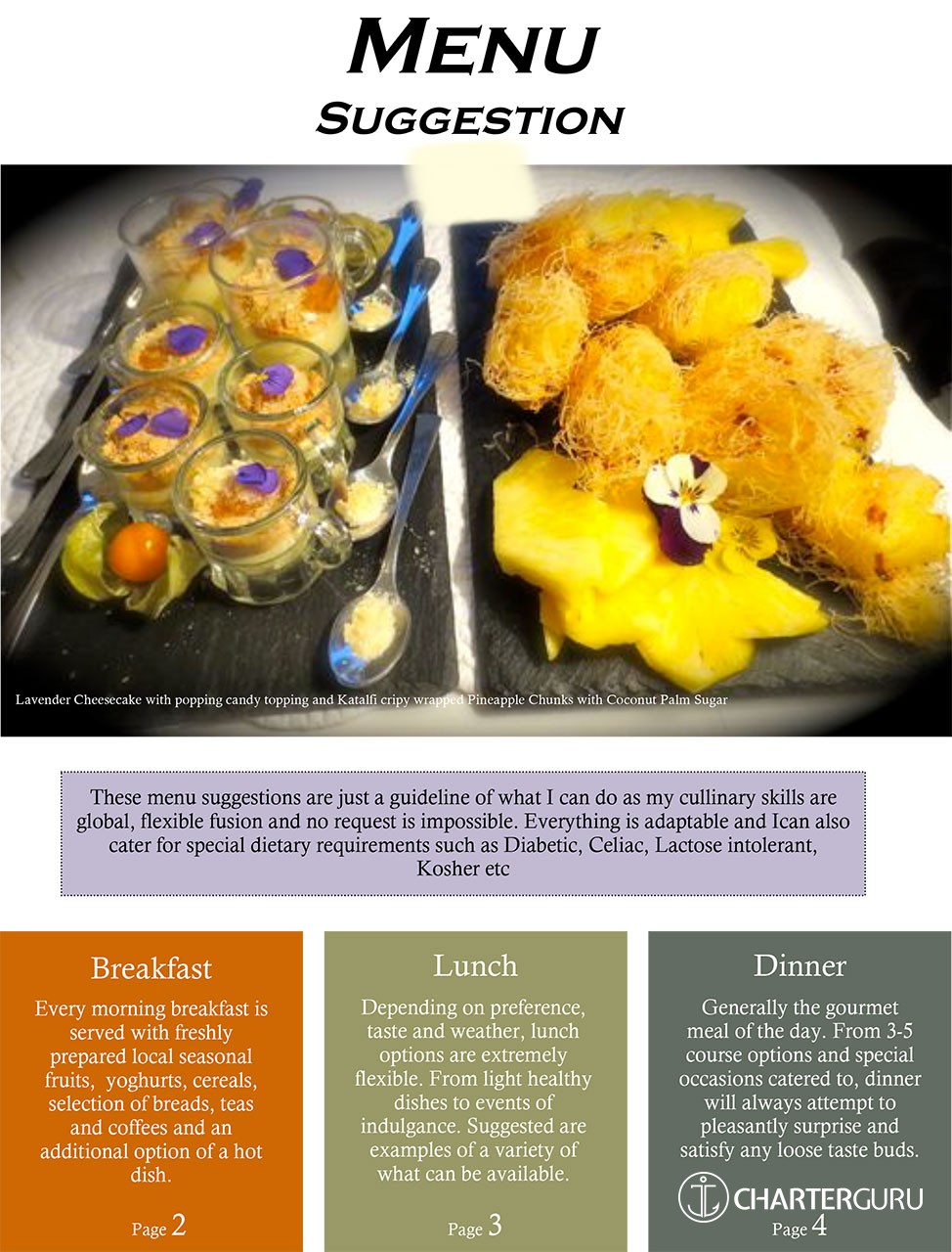 At 21 years old, after a short time at home, I decided to embark on a career on the high seas as a stewardess on sailing boats. I got my first position in France and, that autumn I was lucky enough to cross to the Caribbean on the same boat as the chef. I have never looked back and my interest n the culinary arts has grown from there.