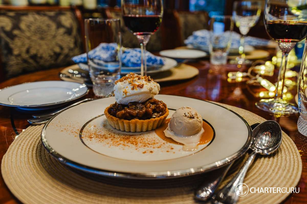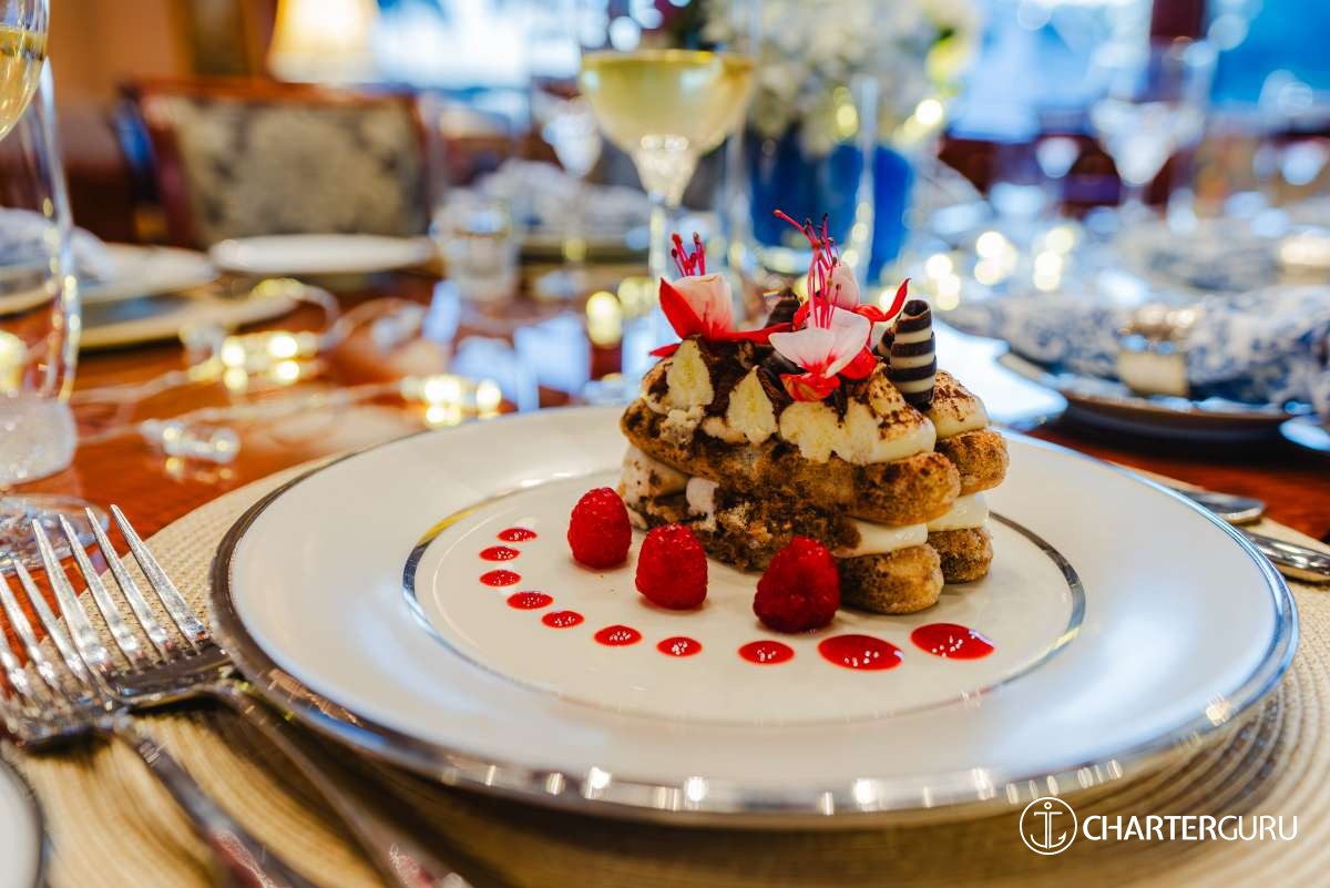 Performance engineering and detailed craftsmanship make CEDAR ISLAND an excellent charter experience. A well-designed layout comfortably sleeps 8 guests in 4 cabins with a large master suite and three VIP staterooms. The interior is finished in custom high-gloss African cherry wood as a spacious main salon boasts comfortable social areas, formal dining for 8, a game table, and a serving bar complete with ice maker and wine cooler.