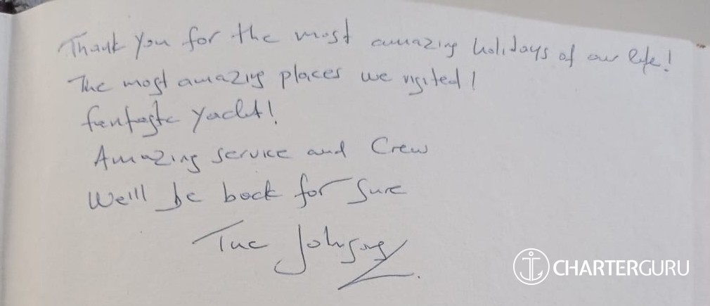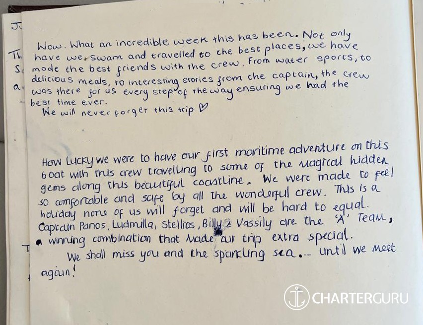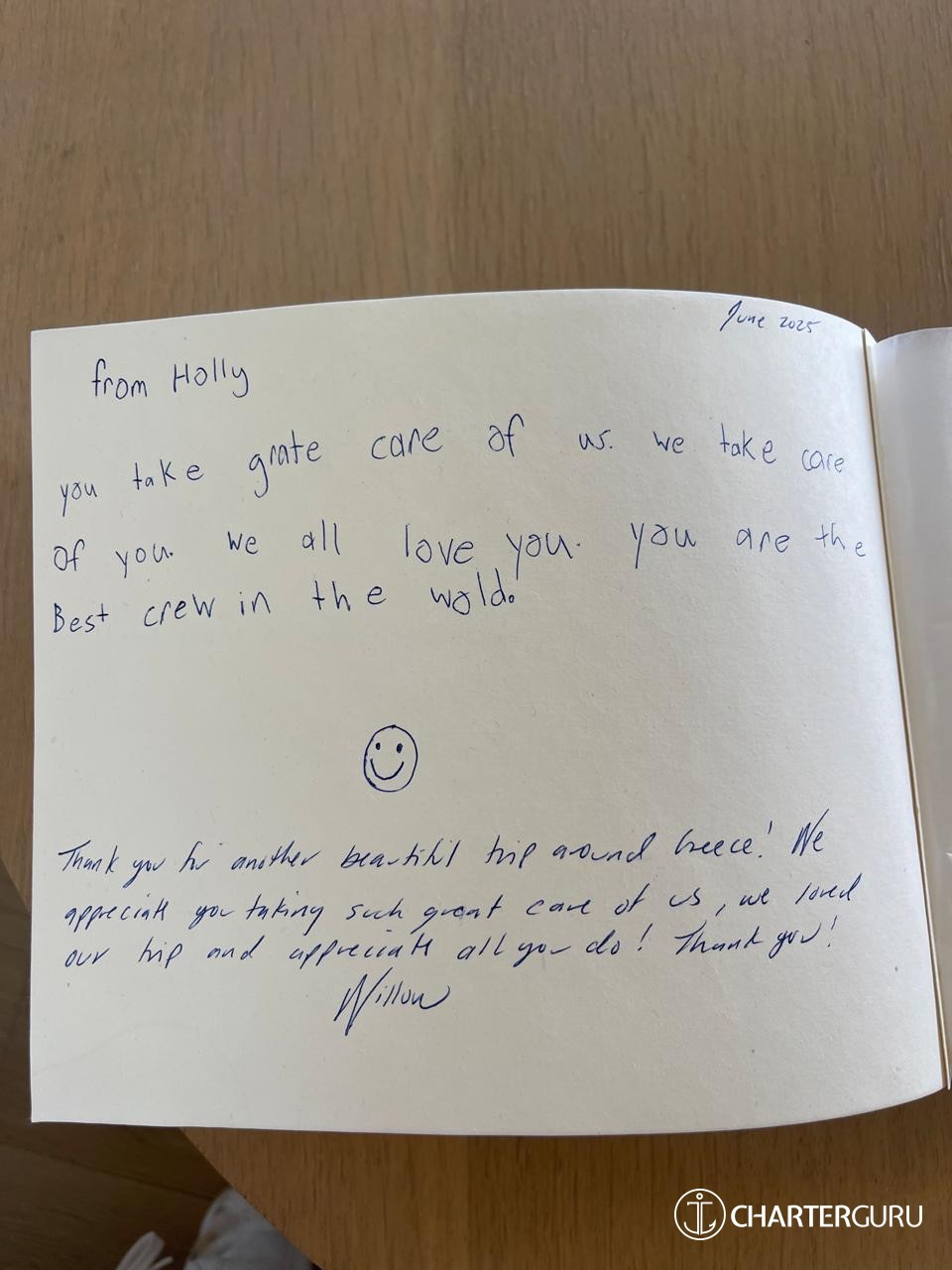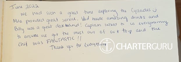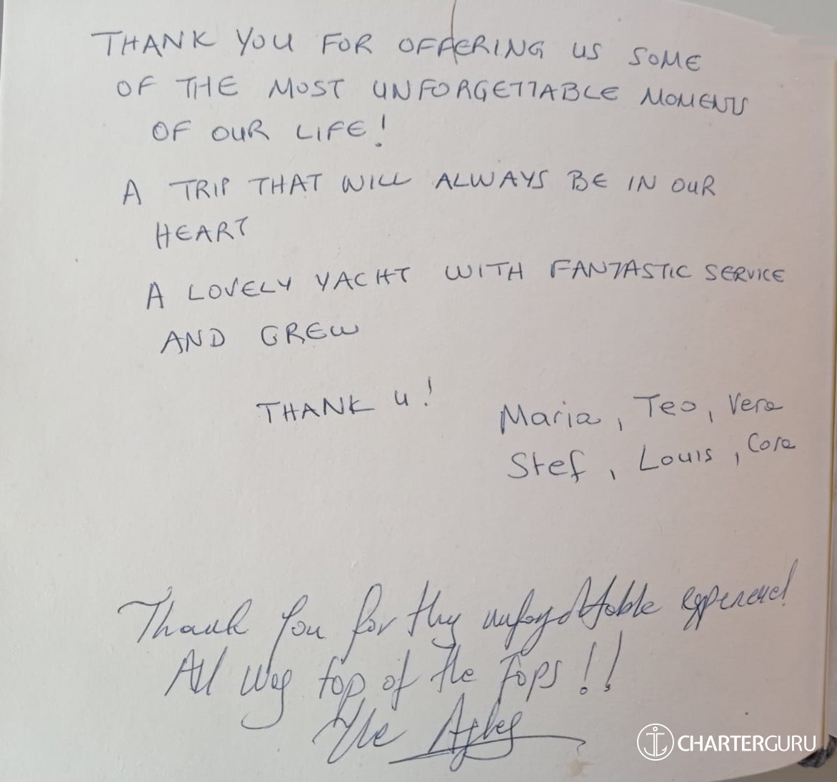 The most amazing holiday I've ever been on, largely attributable to the incredible captain and crew who are quite simply the best at what they do. The captain knew all the best spots, and inside knowledge allowing us to always be the first boat to arrive and get the optional docking space. Stelios prepared delicious feasts that were engaged by all, especially given the limitations of what we eat. Milla was exceptional at service, all on her own, and her joyful attitude made everyone smile throughout. Billy and Vassily were incredibly attentive with all the water toys and made everyone feel safe.