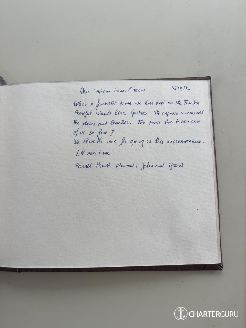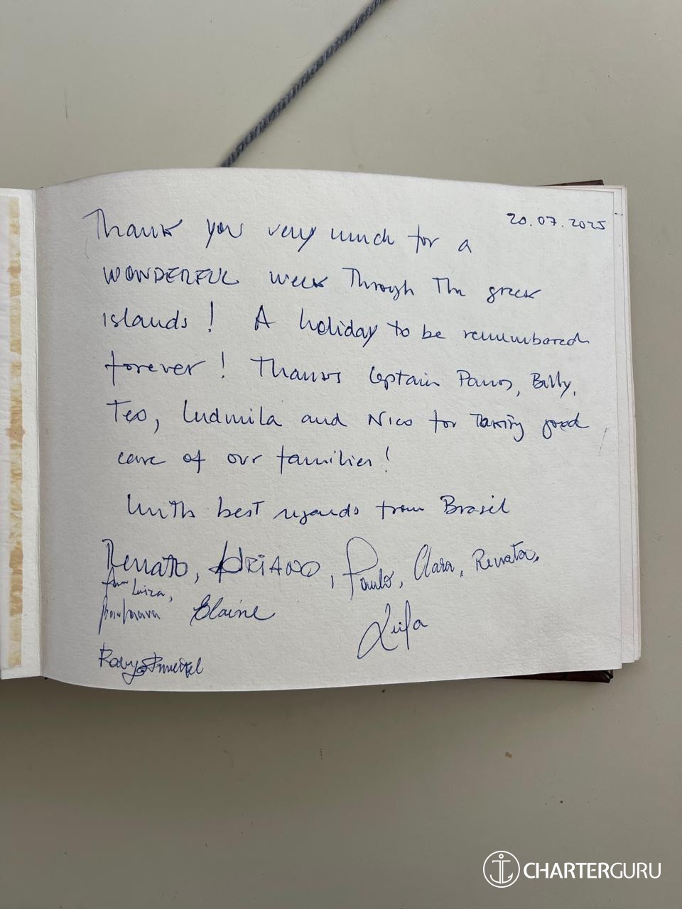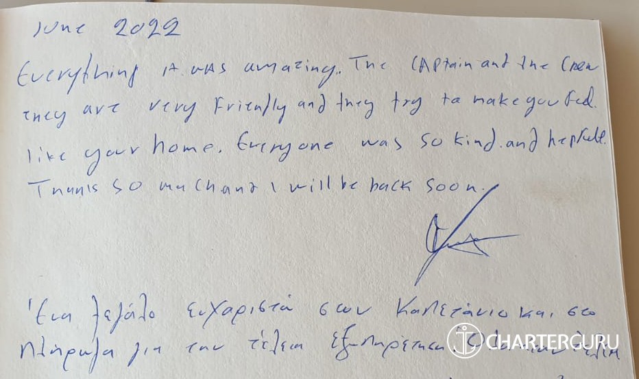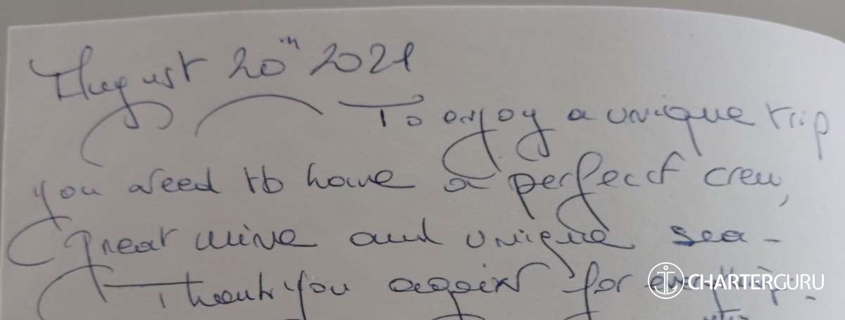 The most amazing holiday I've ever been on, largely attributable to the incredible captain and crew who are quite simply the best at what they do. The captain knew all the best spots, and inside knowledge allowing us to always be the first boat to arrive and get the optional docking space. Stelios prepared delicious feasts that were engaged by all, especially given the limitations of what we eat. Milla was exceptional at service, all on her own, and her joyful attitude made everyone smile throughout. Billy and Vassily were incredibly attentive with all the water toys and made everyone feel safe.