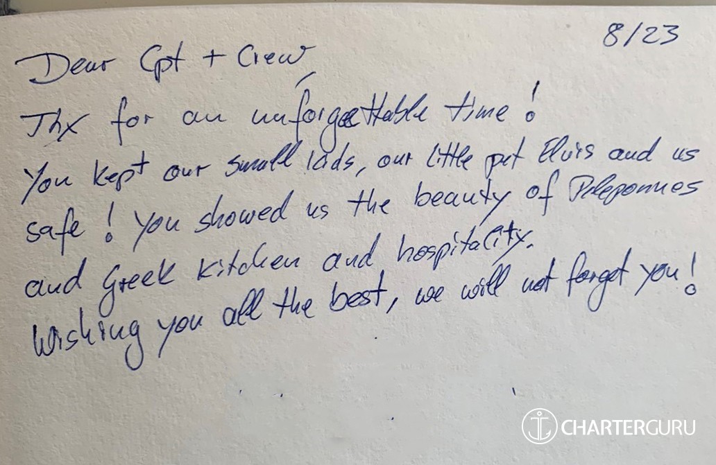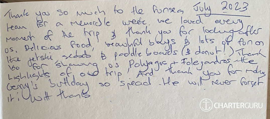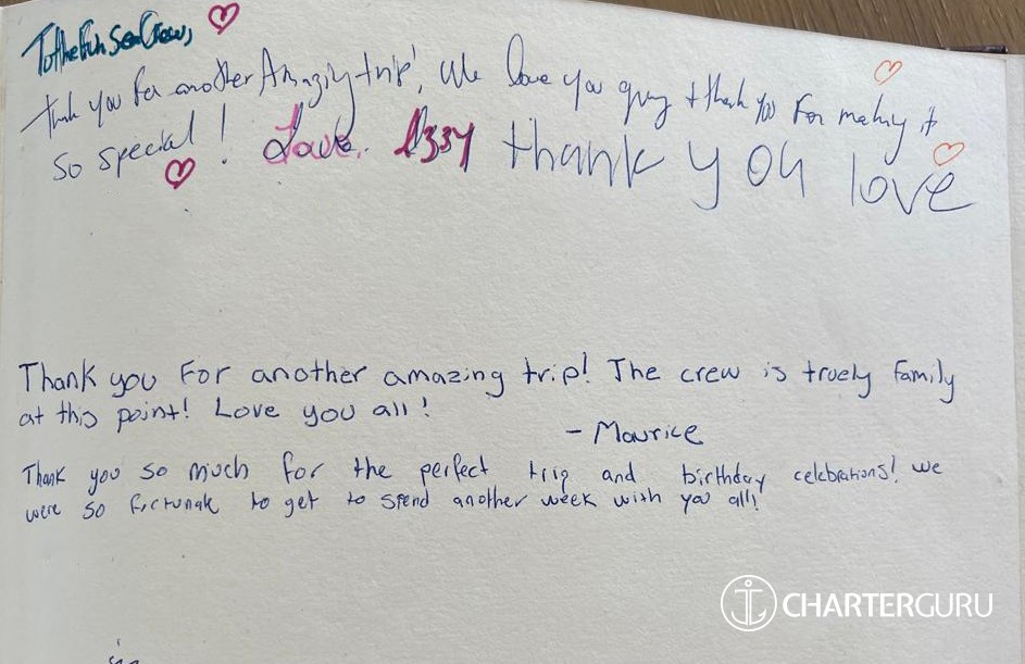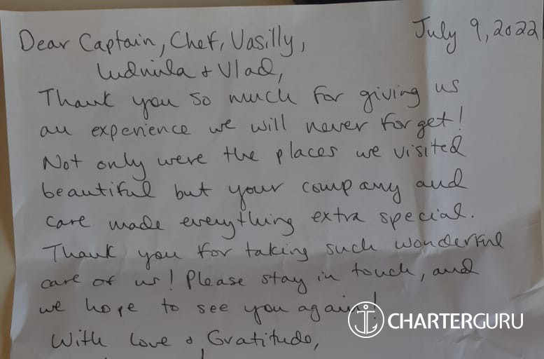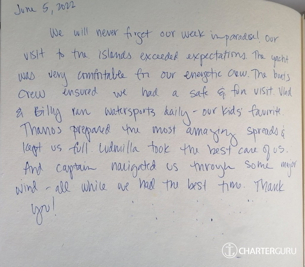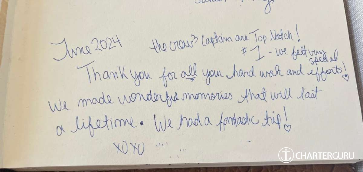 We wanted to extend our heartfelt. Thanks for an absolutely incredible experience sailing through the islands. From start to finish, everything was wonderful. The food, the swimming sports, and the islands were amazing - and, most of all, the amazing crew who made it all so enjoyable.