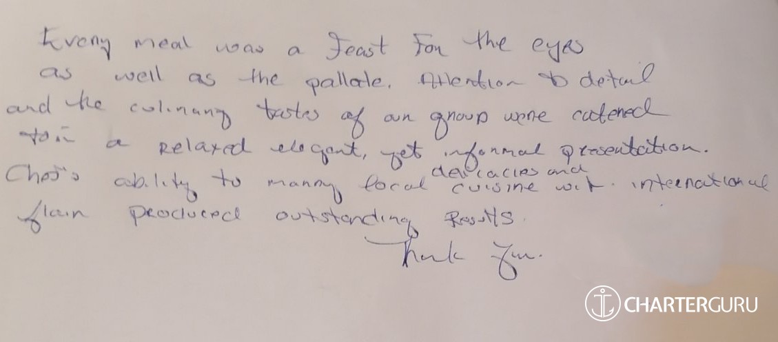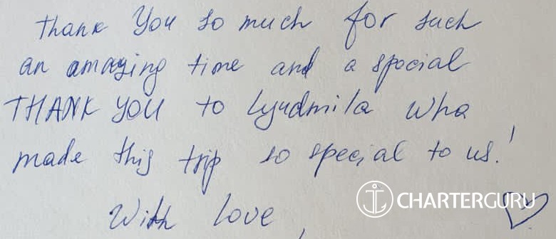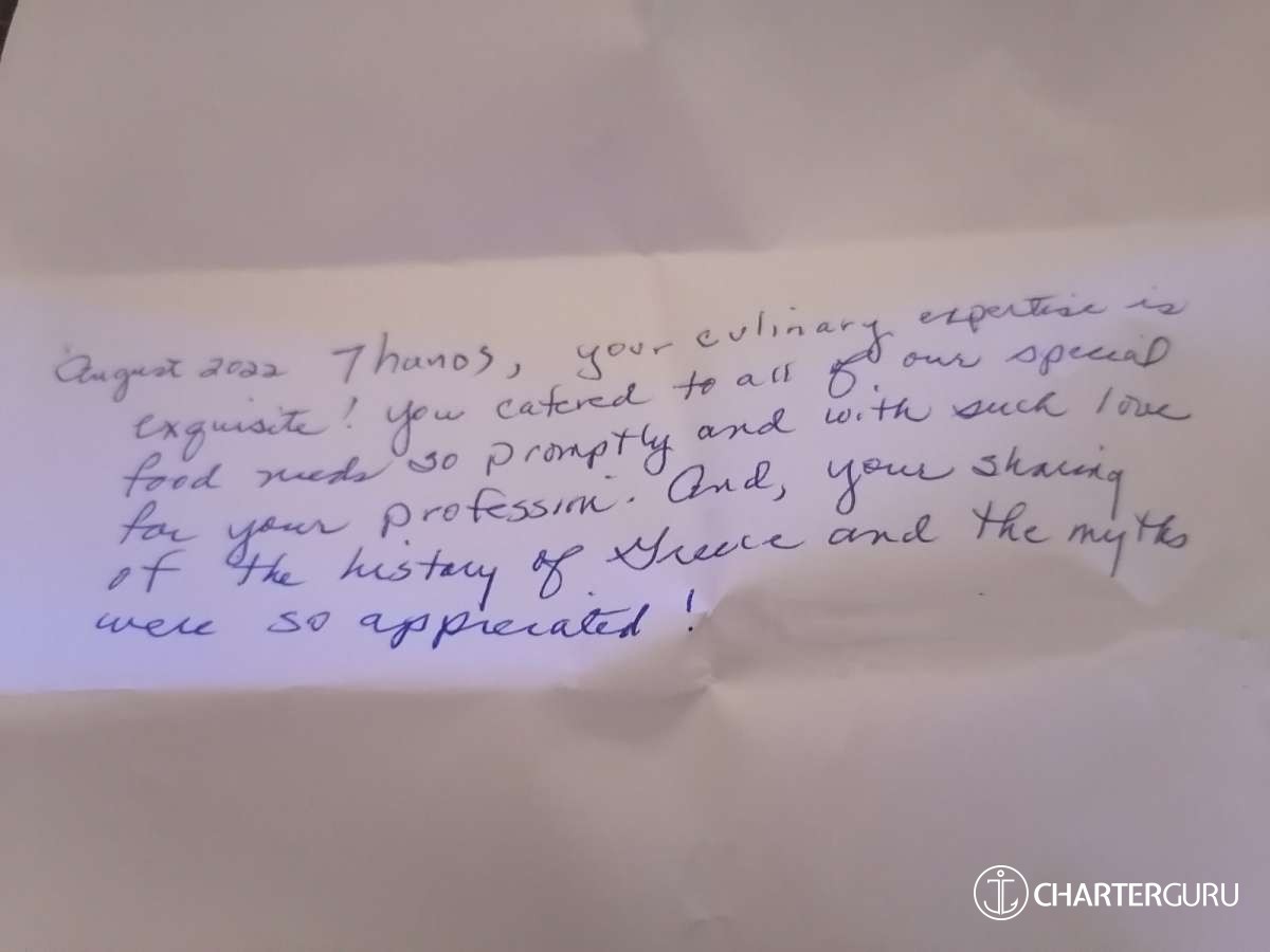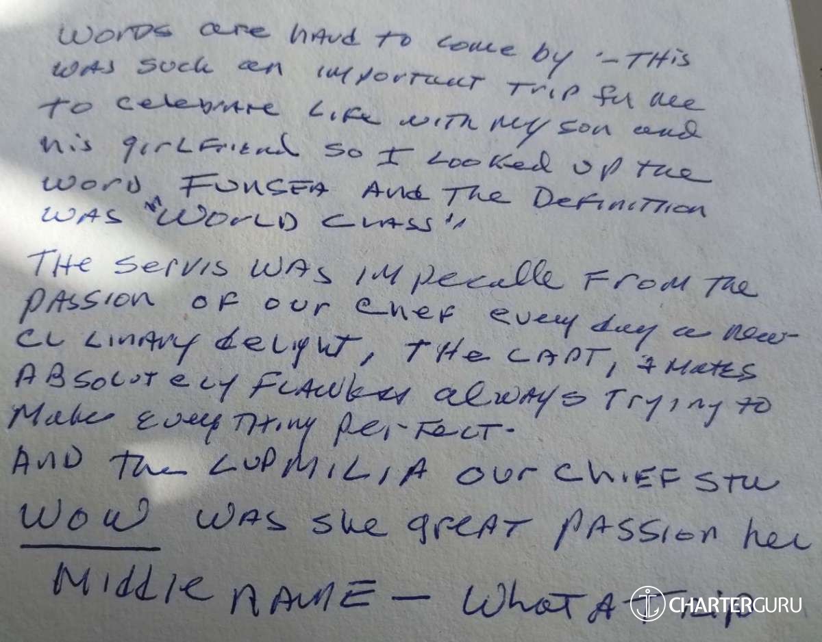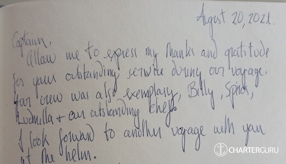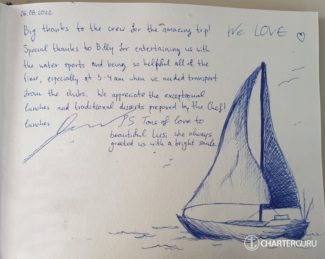 We wanted to extend our heartfelt. Thanks for an absolutely incredible experience sailing through the islands. From start to finish, everything was wonderful. The food, the swimming sports, and the islands were amazing - and, most of all, the amazing crew who made it all so enjoyable.