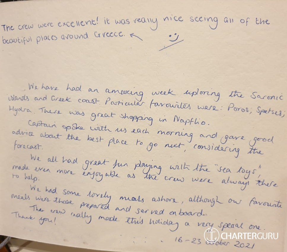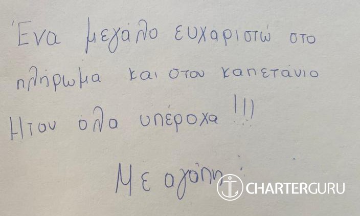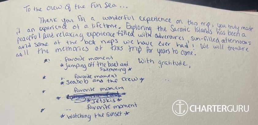 Thank you for a wonderful experience on this trip, you truly made it an experience of a lifetime. Exploring the Saronic islands has been a peaceful, bird relaxing experience filled with adventures, sun-filled afternoons, and some of the best naps we have ever had. We will treasure all the memories of this trip for years to come