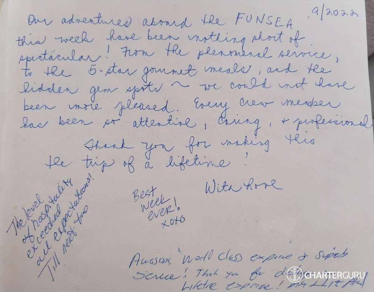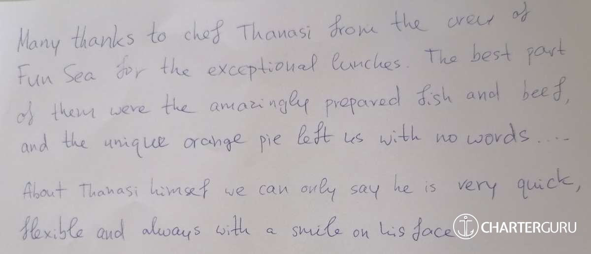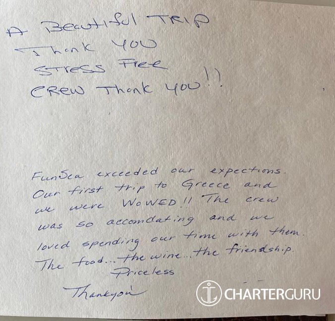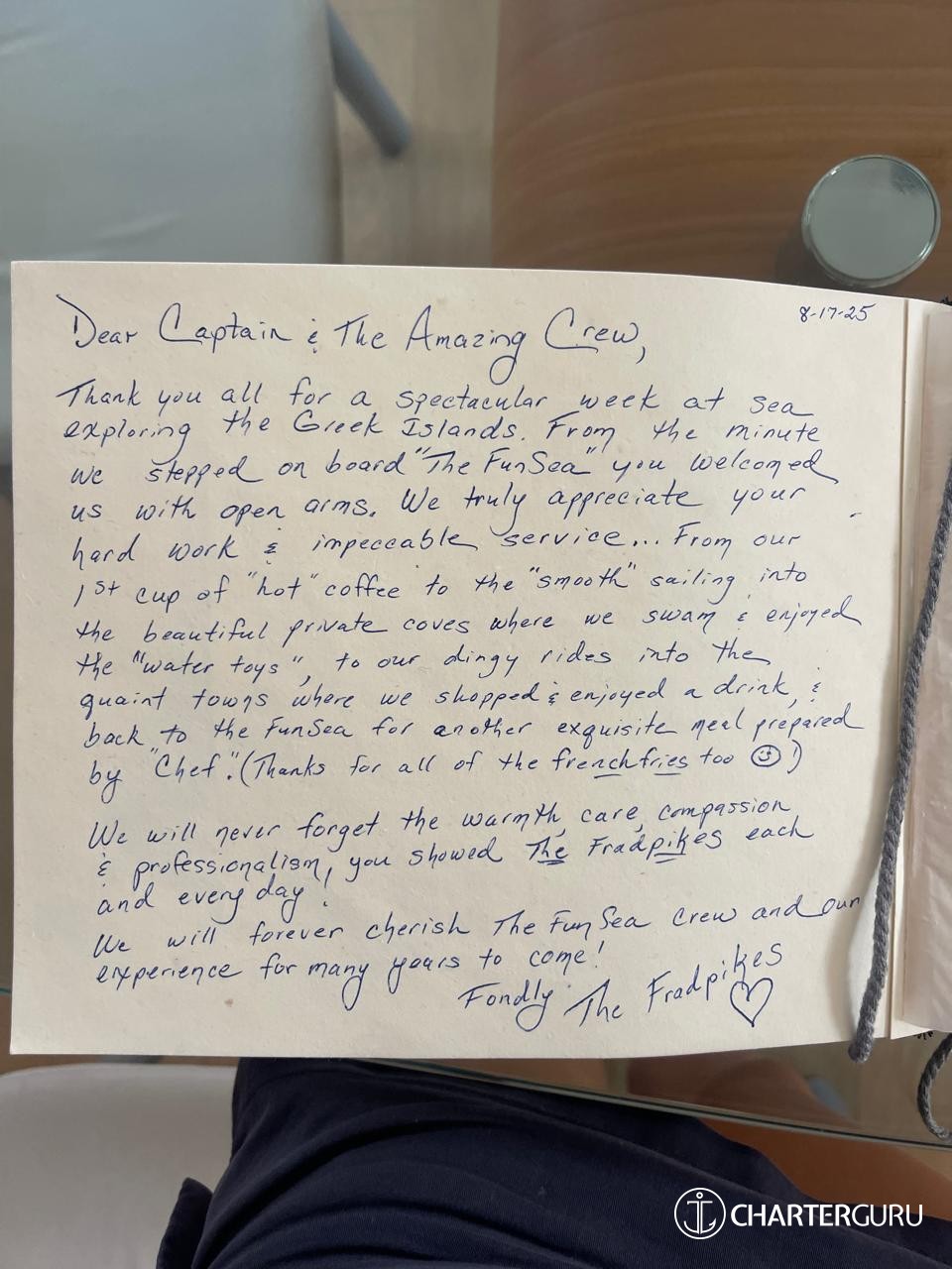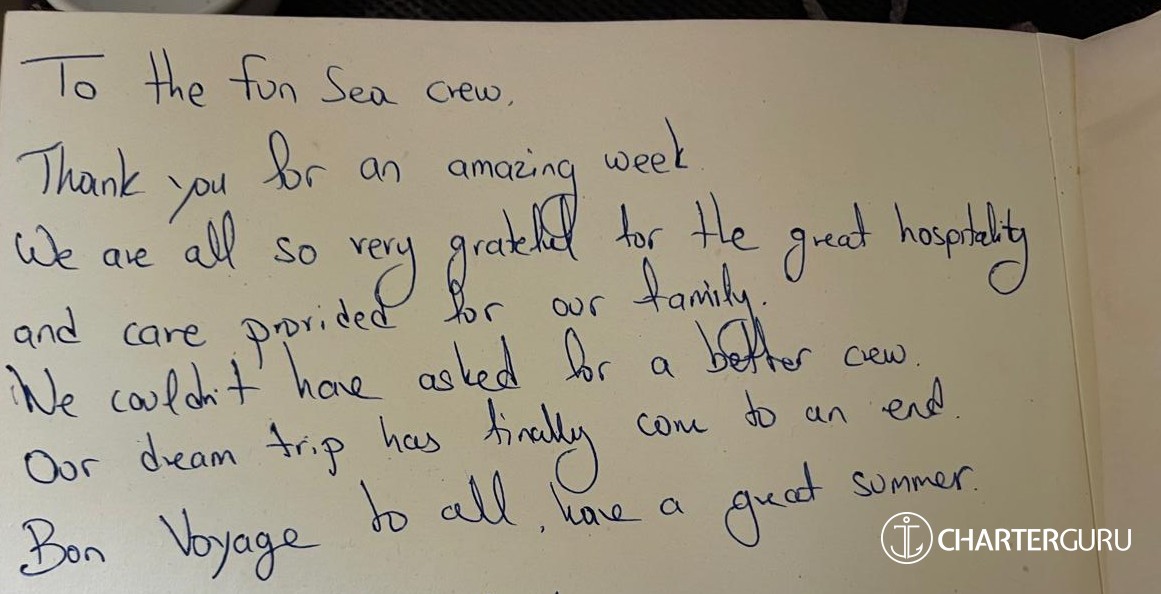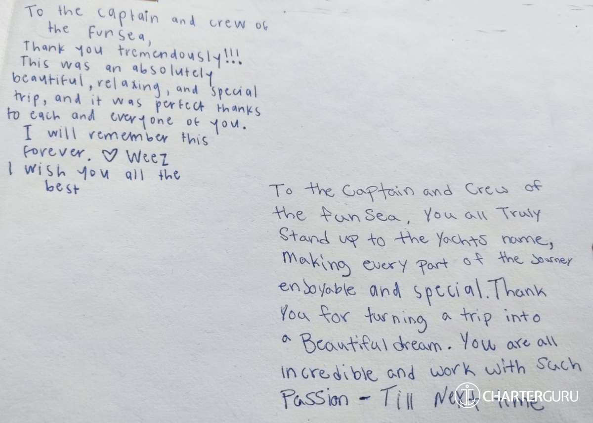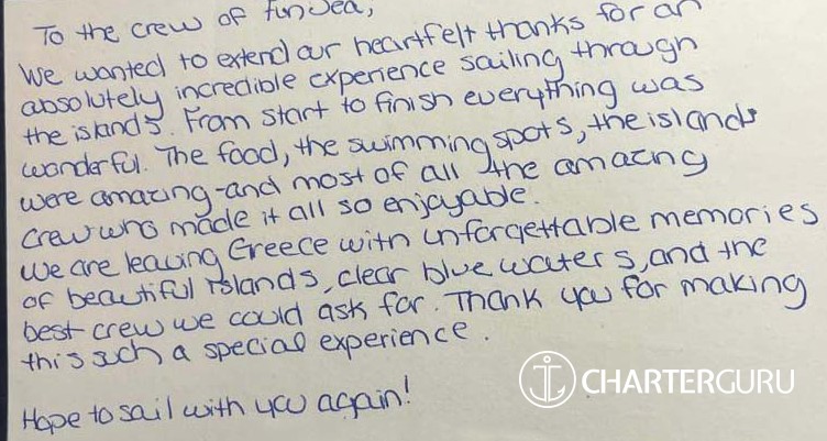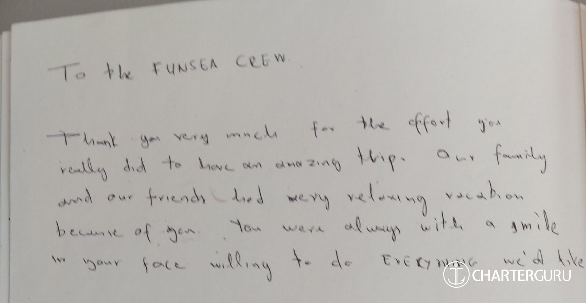 We recently chartered FUN SEA from july 1-8, I wanted to write to let you know the boat crew was IMPECCABLE! Professional, accommodating, amazing people and they ensured we had one of the best vacations of our lives! And really it was thanks to this staff!