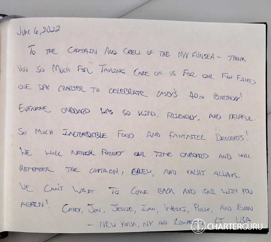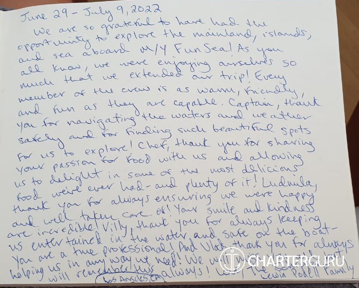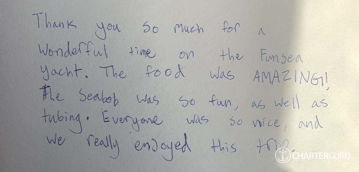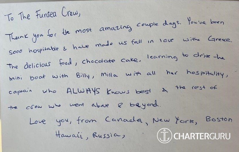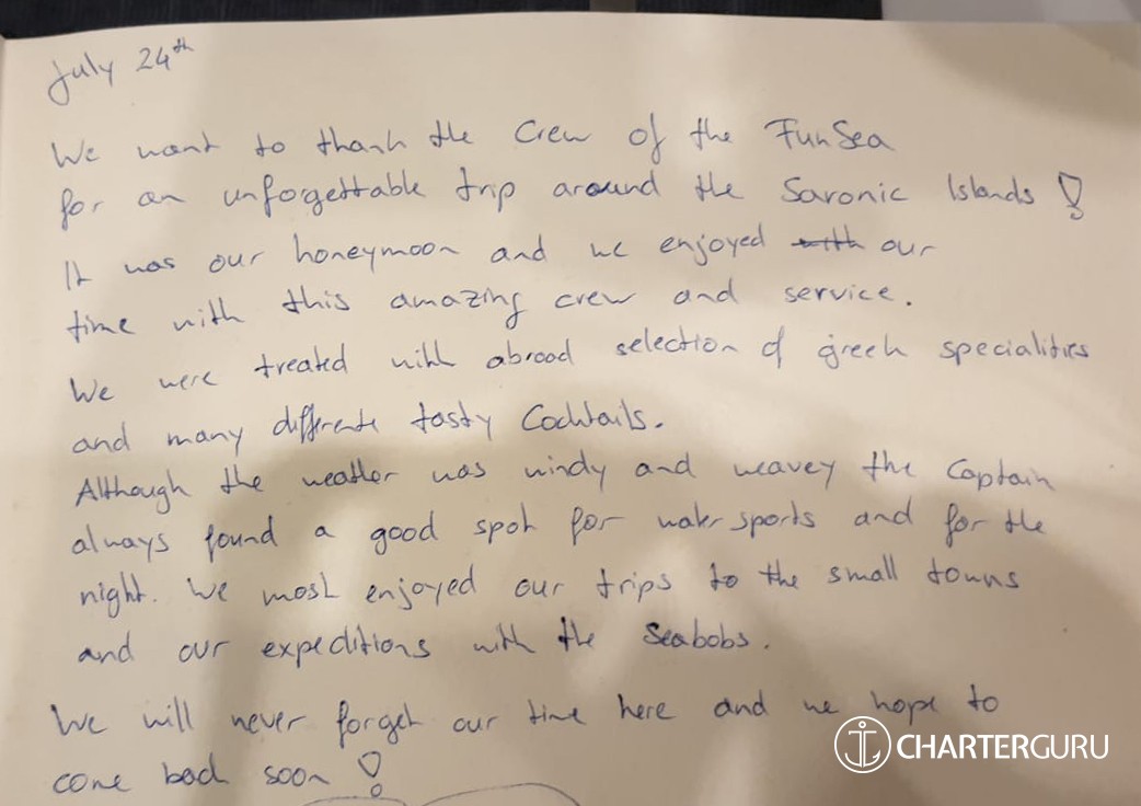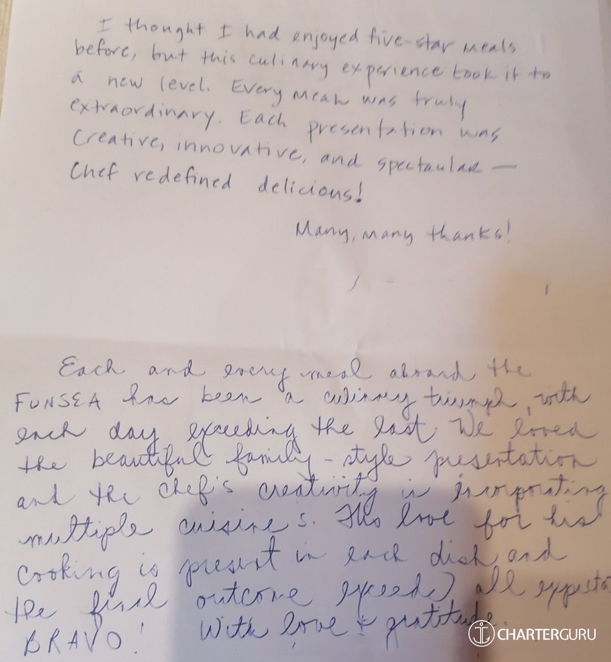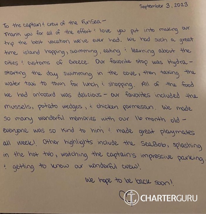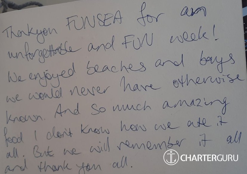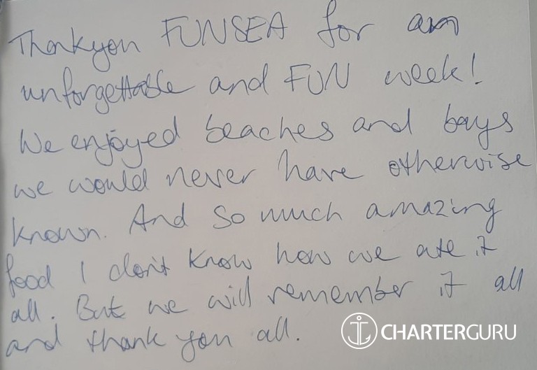 We recently chartered FUN SEA from july 1-8, I wanted to write to let you know the boat crew was IMPECCABLE! Professional, accommodating, amazing people and they ensured we had one of the best vacations of our lives! And really it was thanks to this staff!