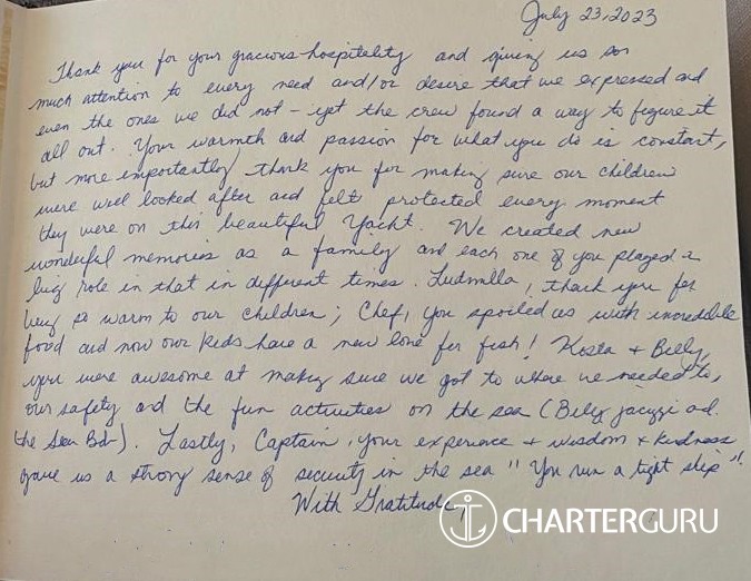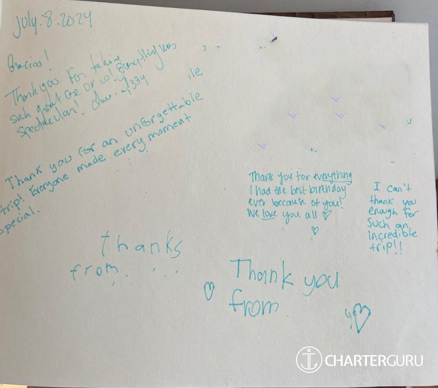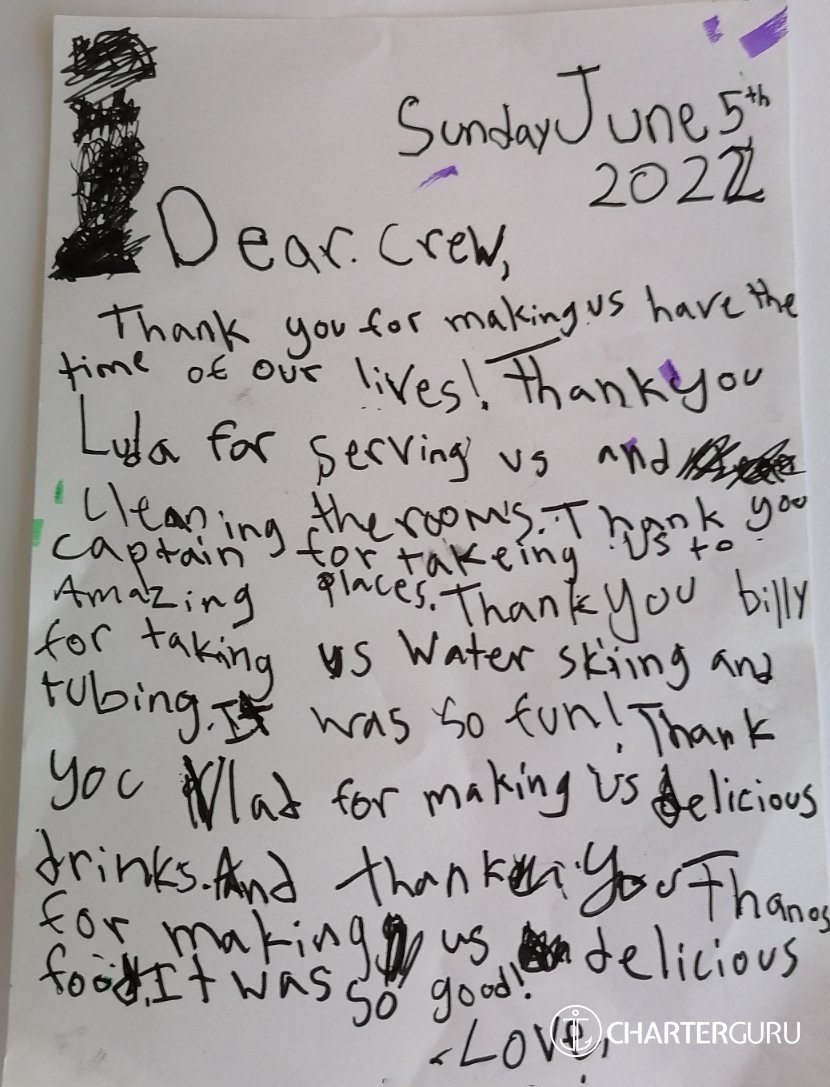 Thank you for making us have the time of our lives. Thank you Ludi for serving us and cleaning the rooms. Thank you captain for taking us to amazing places. Thank you Billy for taking water skiing and tubing. It was so fun. Thank you Vlad for making us delicious drinks. And thank you Thanos for making us delicious food. It was so good.