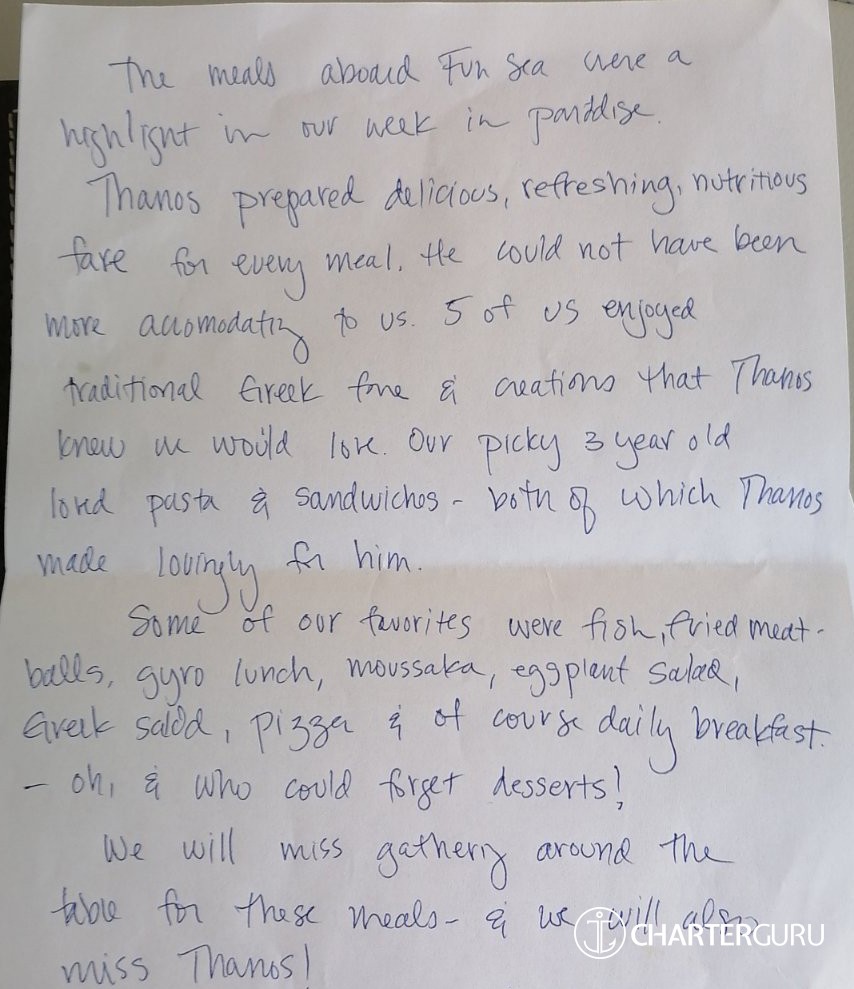 Thanos prepared delicious refreshing nutritious fare for every meal, the could not have been more accommodating to us, 5 of us enjoyed traditional Greek food and creations that Thanos knew and would love. Our picky 3 years old loved pasta and sandwiches - both of which Thanos made lovingly for him.