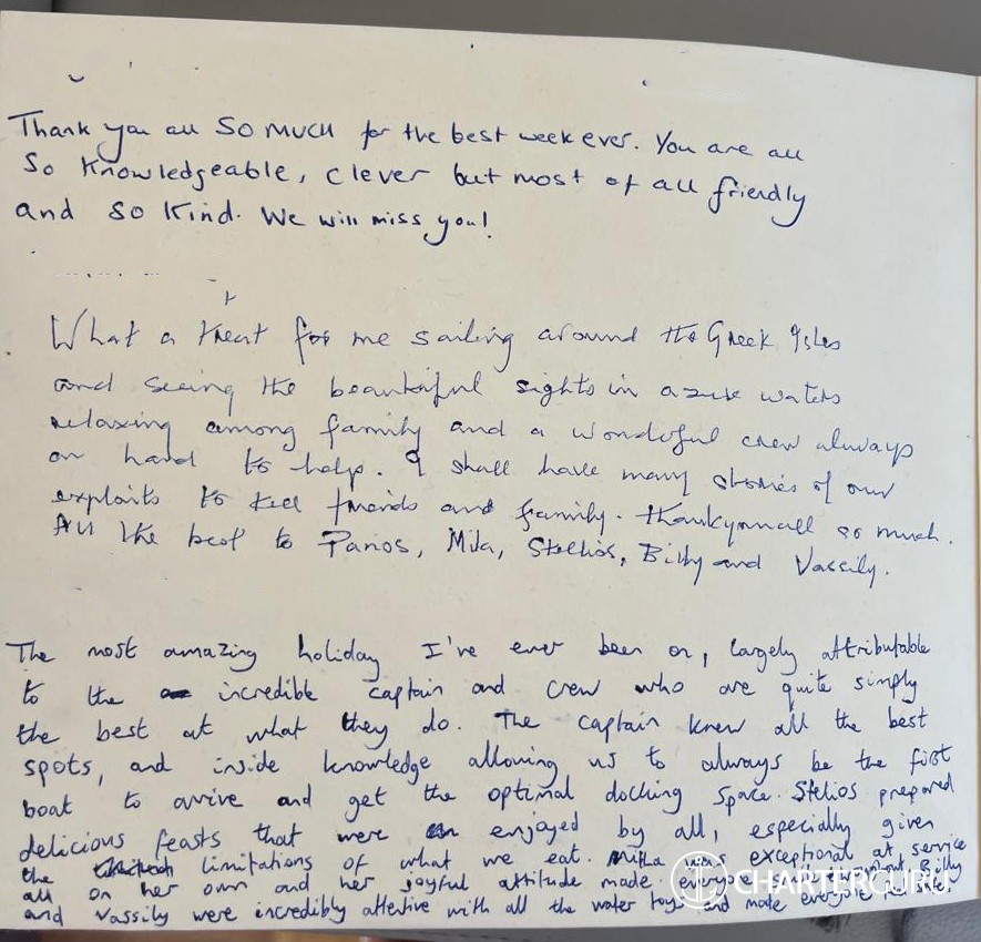 What a treat for me sailing around the Greek Isles and seeing the beautiful sights in azure waters, relaxing among family, and a wonderful crew always on hand to help. I shall have many stories of ours to explain to kid friends and family. Thank you all so much