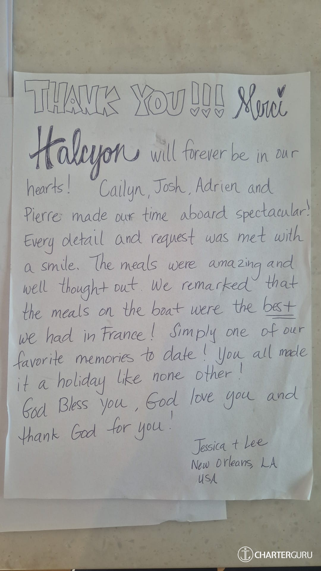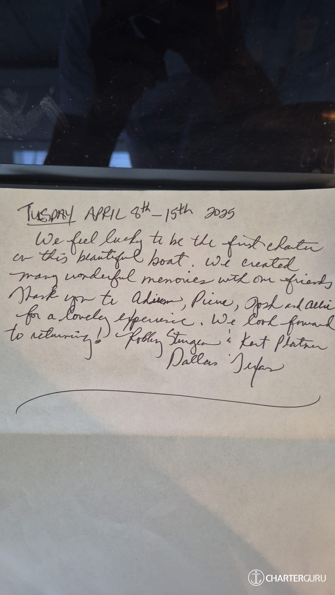 We cannot thank you enough for an unforgettable week. Christina, every meal left us speechless and stuffed with amazing food. Between the smoothies, charcuterie boards and scrumptious desserts, it will be hard re-adjusting back at home. I think collectively we have each gained a few pounds but it was well worth it. Merci Beaucoup Adrien, our voyage couldn't have been any smoother. Thank you for being there whenever we needed a ride on the dinghy, and for helping us around the ship whenver we needed it.