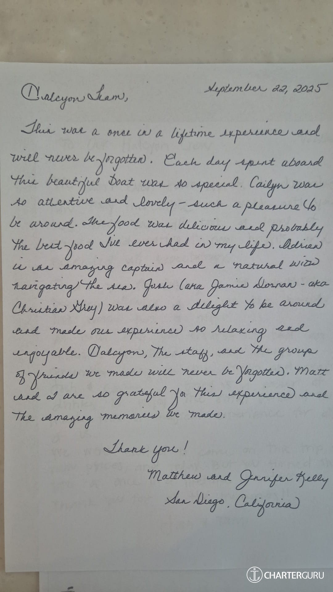 -You have all been so kind and attentive and our trip wouldn't be as memorable as it was without all of your hard work. Thank you for giving us such an unforgettable trip and we wish you all the best!