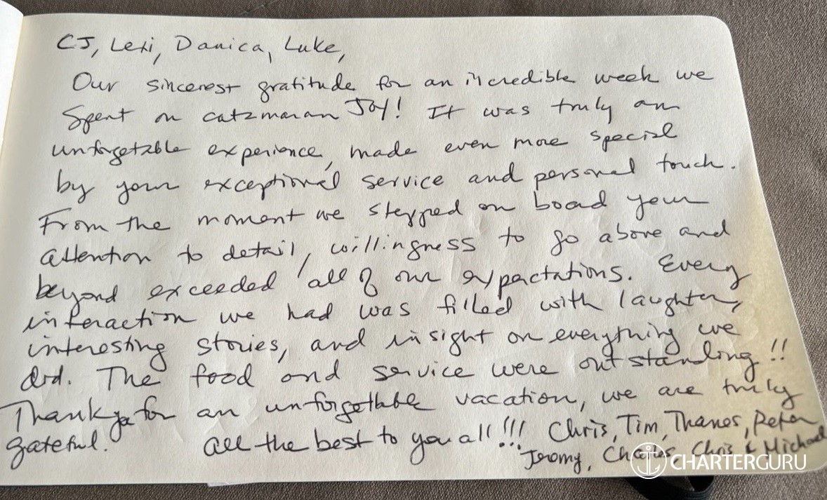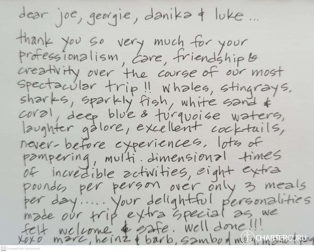 Thanks you so much for this amazing cruise on a beautiful catamaran. Joy is top of all the perfect words for an unforgettable holiday, with a perfect crew, very professional, however being very friendly, and also with amazing food, very healthy and tasty. Thanks again for everything and hope to be [back] aboard very soon.