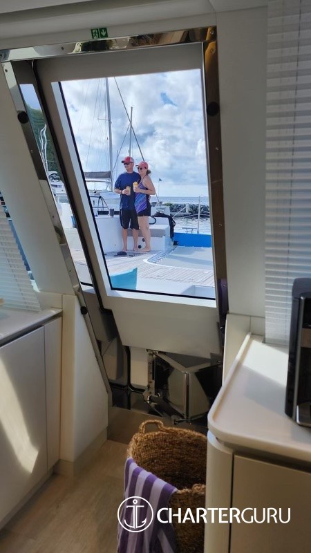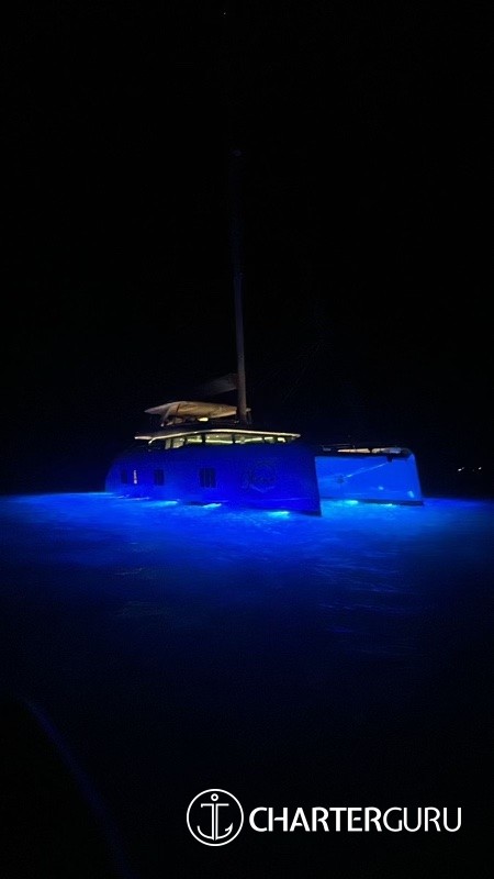 Unique to Ohana, a day-head is located in the aft cockpit to allow for maximum comfort during the day. The day head is complete with a wash basin and changing table for our younger guests. In addition, there are two waterfall shower heads by each aft sugar scoop for fresh water rinses throughout the sunny, salty days. Underwater lights line the waterline for an added ambiance in the evening.