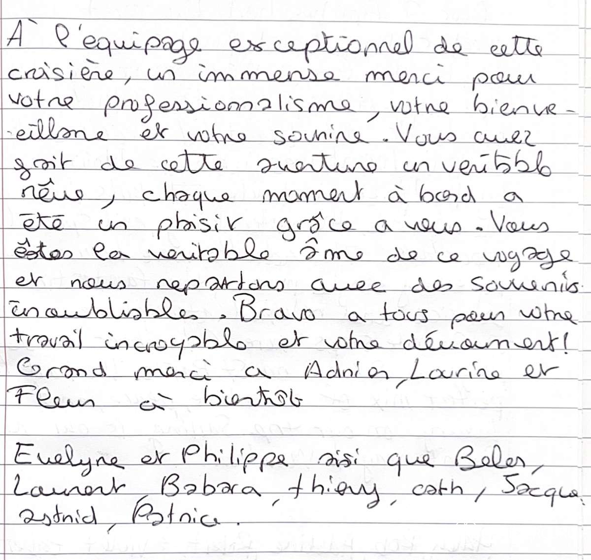 In any case, the crew did an excellent job, demonstrating great availability, especially considering the presence of two very young children on board, with special needs (bottle feeding, special lunches and dinners for the two-year-old, etc.).