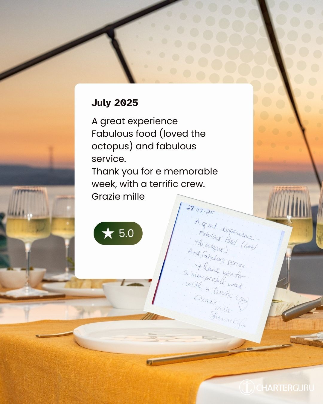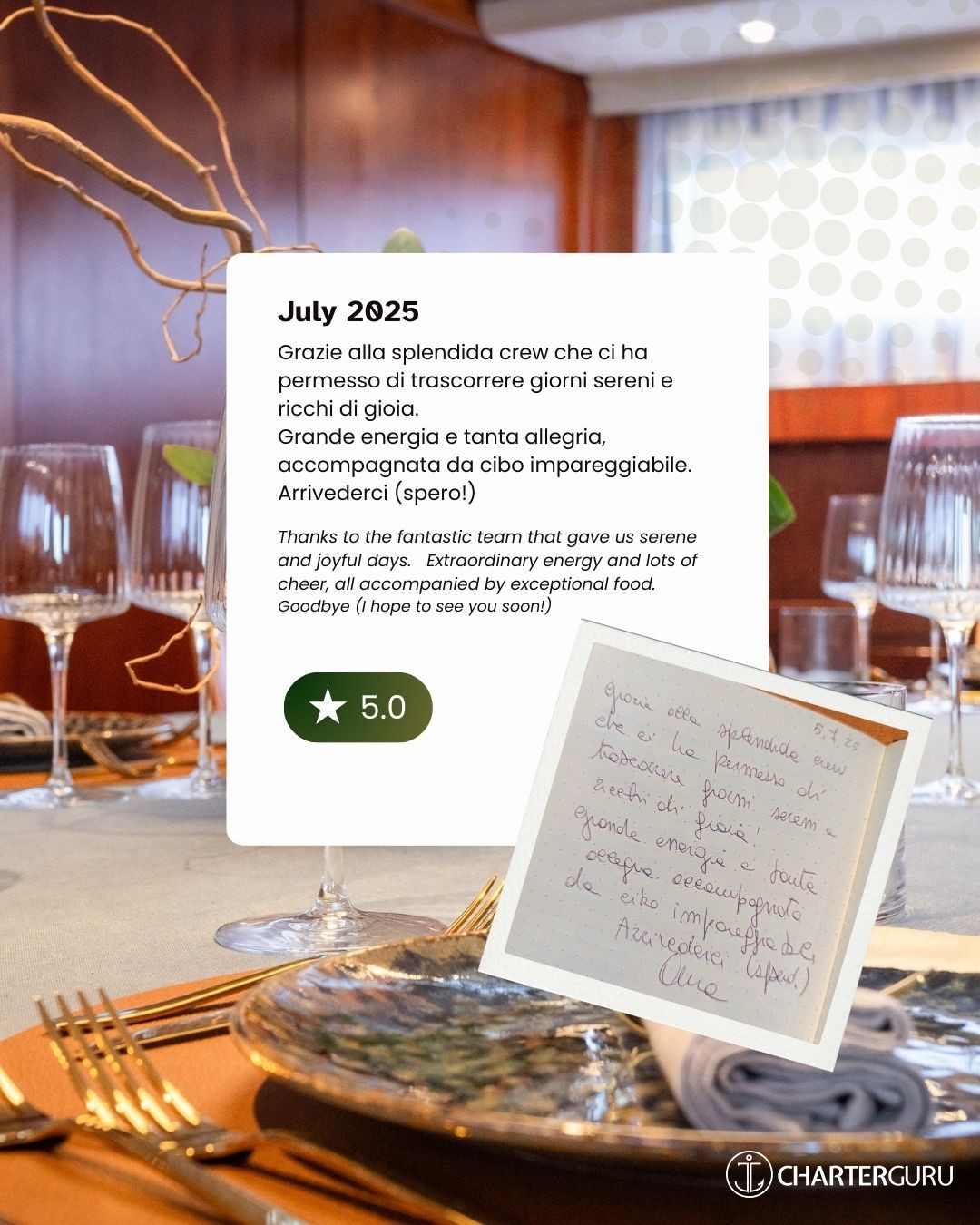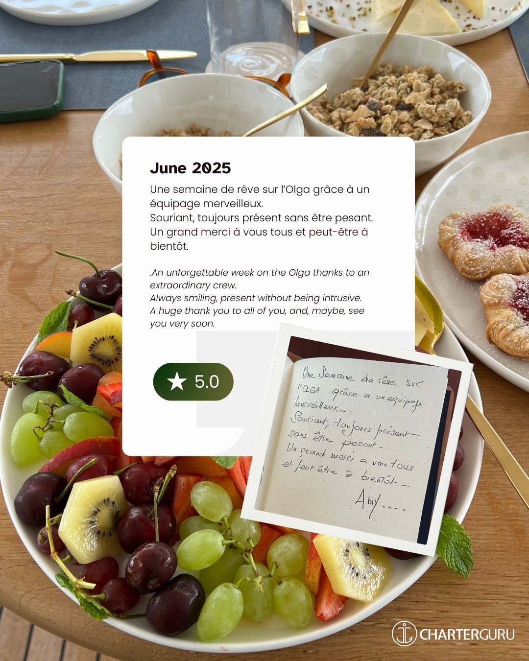 It's difficult, indeed impossible, to achieve a perfect balance between the comfort of the boat, five-star food, and a good dose of magic... THANK YOU VERY MUCH!