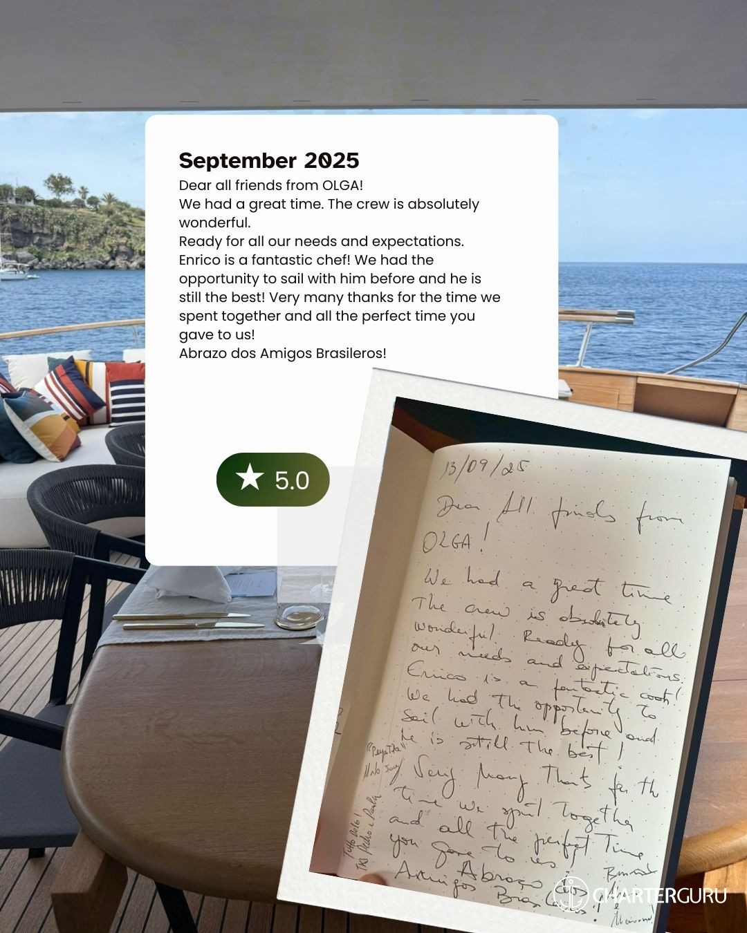 Dear crew of the Olga: Diana — Francesco Jr, Francesco Sr, Enrico and Michela — you’ve made these holidays unforgettable. You helped us feel comfortable, free and happy. Thank you for your kindness, generosity and for embracing the little craziness of us old folks. A big hug. I’m sure we’ll meet again.