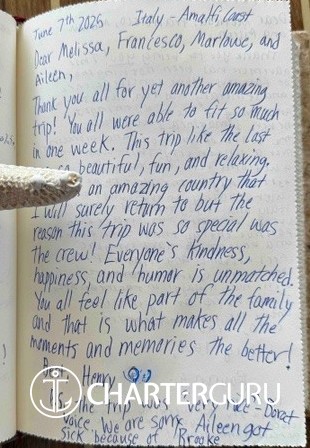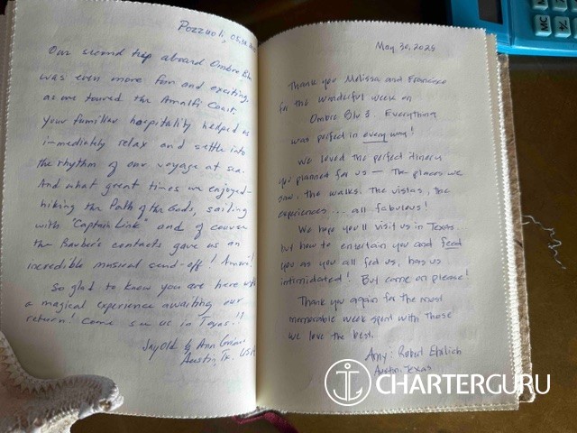 Two words... perfect Trifecta!!! Three different locations, three different sets of friends and family on each charter but the one consistent item is the amazing, friendly, knowledgeable experience you provide every time! Your in-depth knowledge of each location enables us to experience all of the beauty of Italy (with no planning on our part :)) The Ombre Blu culinary experience is on par (or better than) many Michelin Star restaurants! We look forward to seeing that Cookbook someday! Thank you for helping us create more memories that will last a lifetime! Until the next time... With love Rosanne & Chris