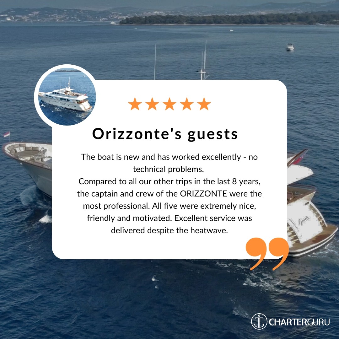 From the outset, Orizzonte captivates with her classic design that appeals to those seeking a perfect blend of comfort and sophistication. Ideal for families or friends, every voyage promises a beautiful experience, whether you're sunbathing on the expansive bow, sharing laughter on the spacious flybridge, or relishing intimate dinners under the stars at a secluded table on the stern.