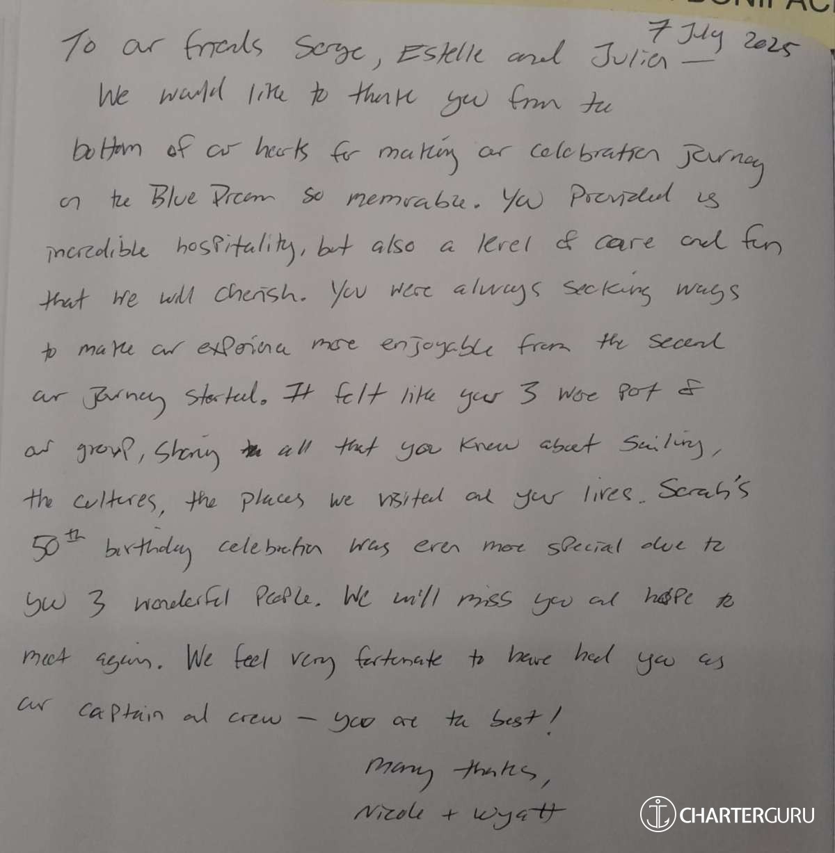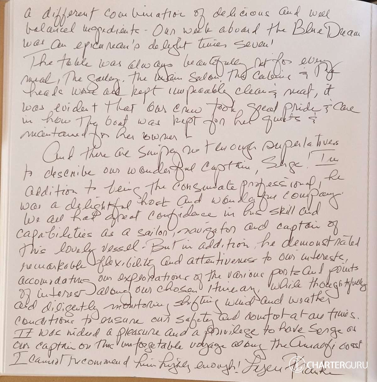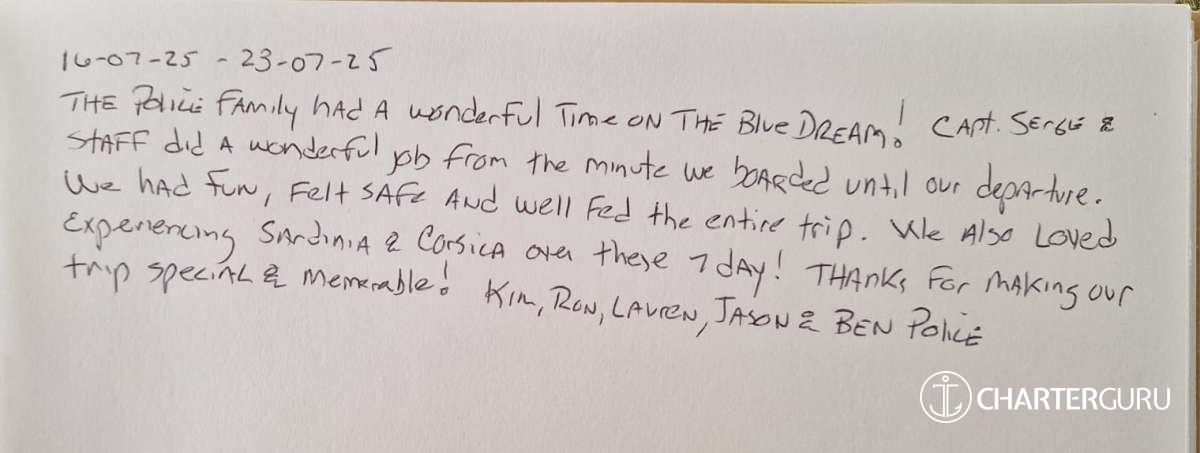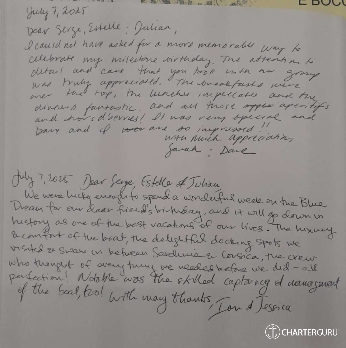 It is with great pleasure that my crew and I will accompany you throughout your cruise on "The Blue Dream".
