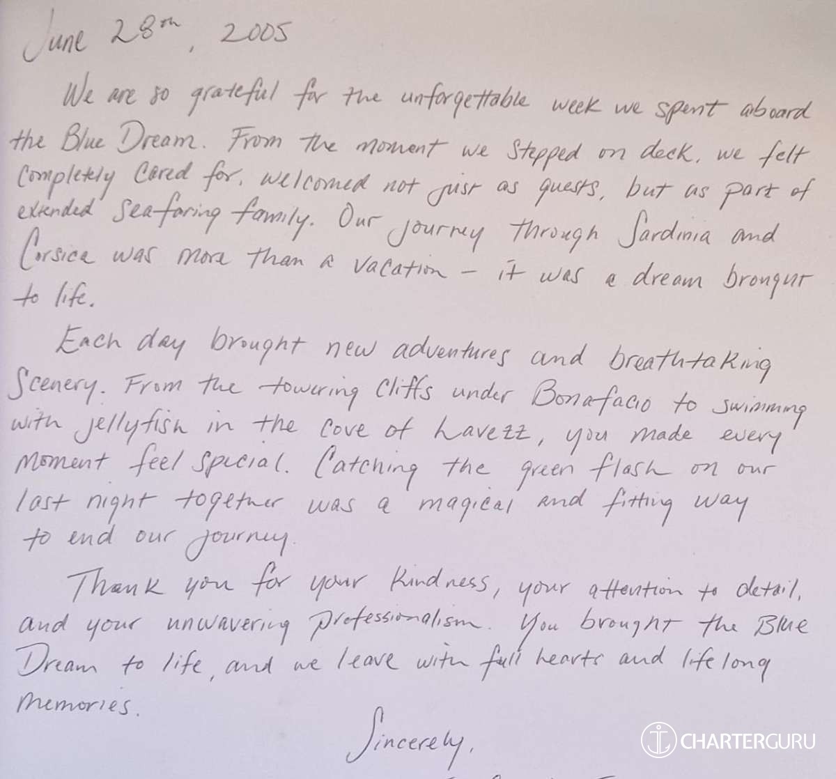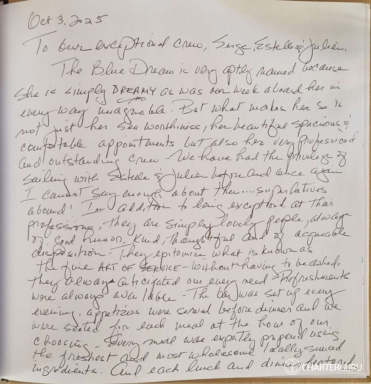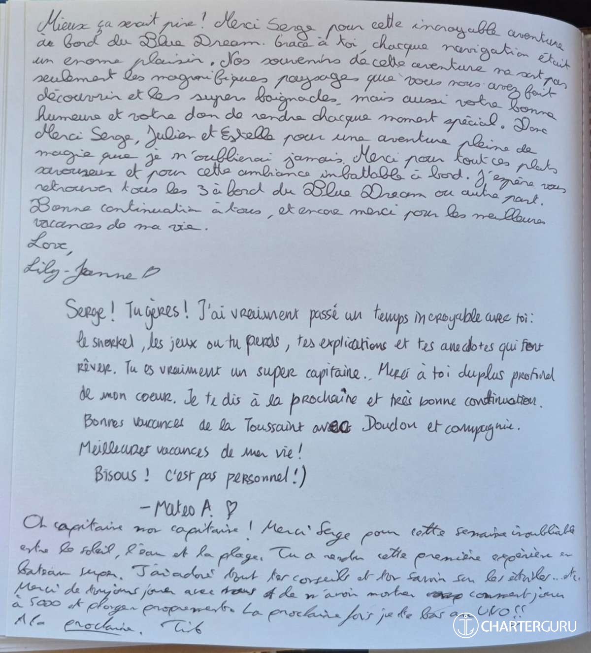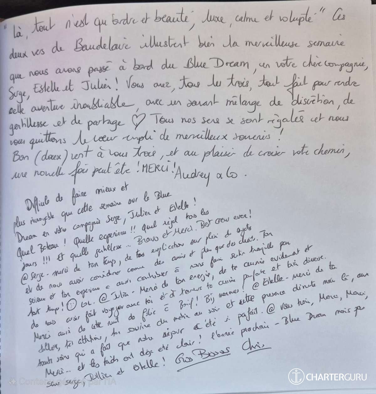 It is with great pleasure that my crew and I will accompany you throughout your cruise on "The Blue Dream".
