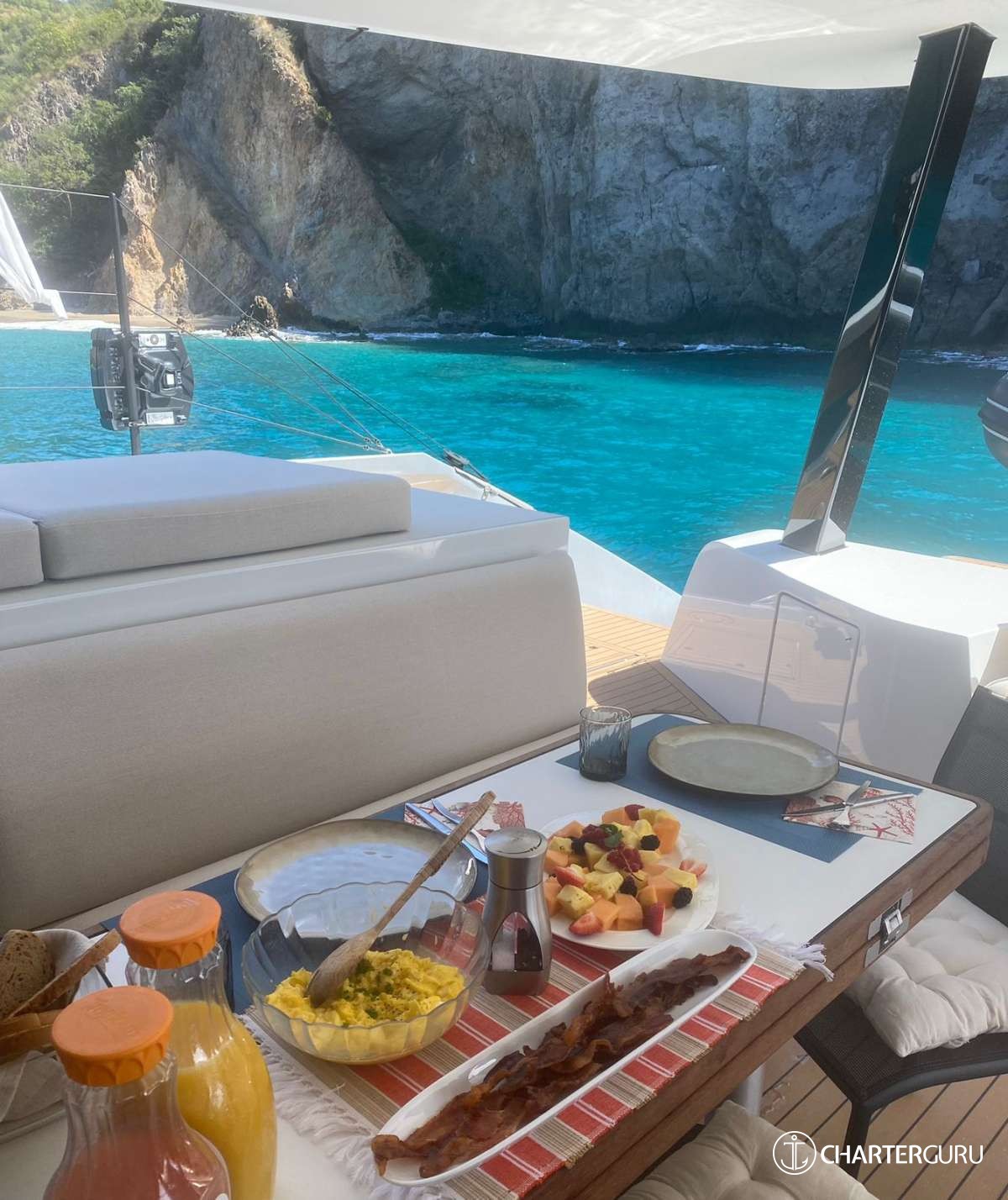 WONDERFUL is introduced primarily as a sailing catamaran. The yacht layout radiates from the main saloon, which connects to the aft deck. The aft deck is expansive, with a comfortable dining and seating area and that's where most of the meals are served. The modern cabins are located below the main saloon, connected by stairs (inquire about handicapped access). The cabins are connected by stairs to the main saloon - roomy, comfortable and pleasant. Multiple portholes offer desirable views, while providing privacy if needed.