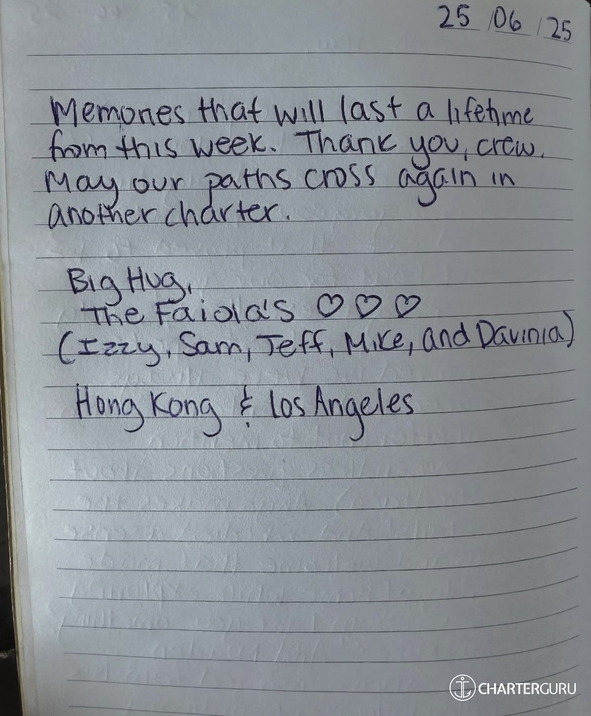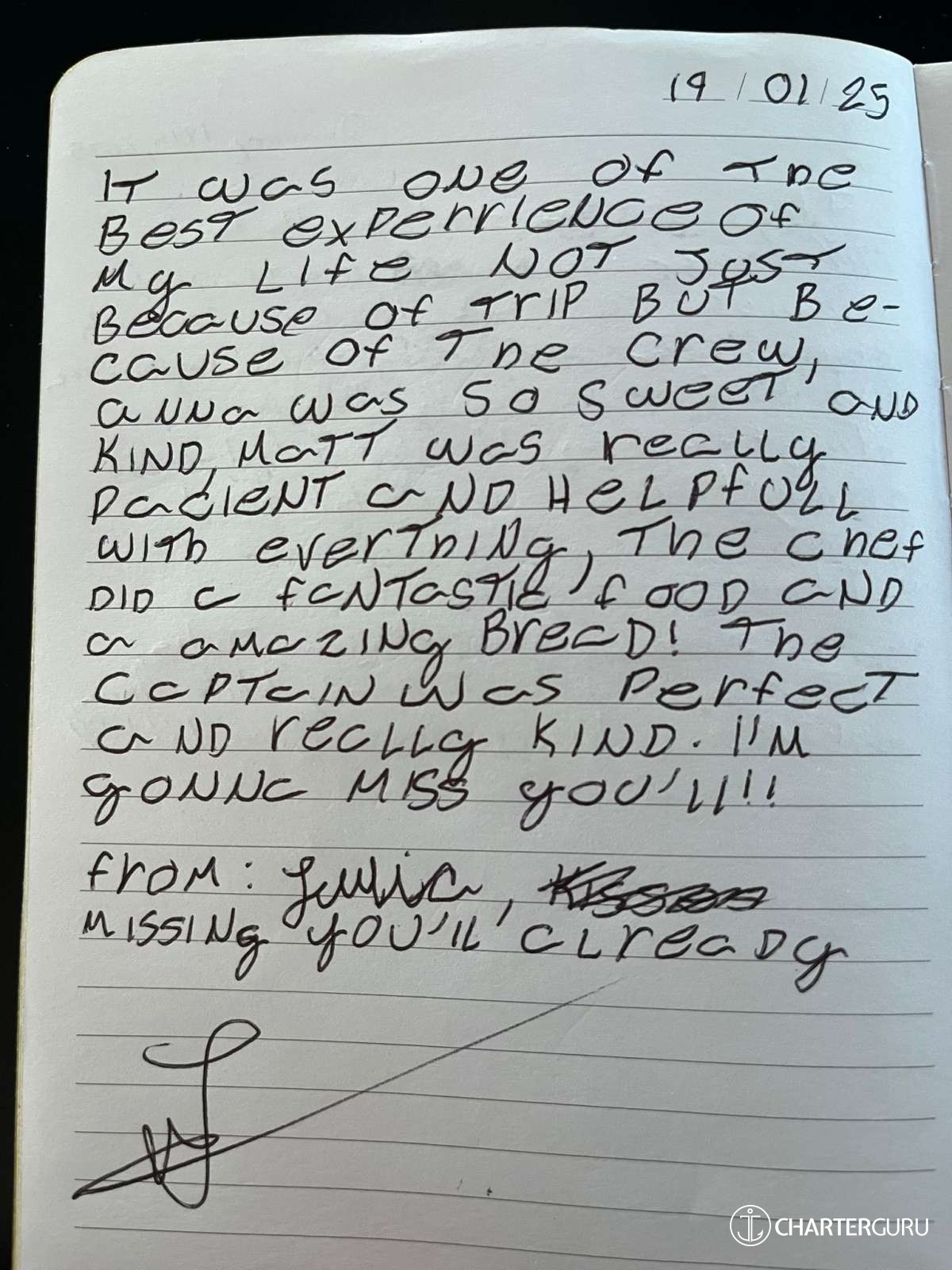 It was one of the best experiences of my life, not just because of the trip, but because of the crew. Anna was so sweet and kind. Matt was really patient and helpful with everything. The chef prepared fantastic food and amazing bread! The Captain was perfect and very kind. I’m going to miss you all!!
